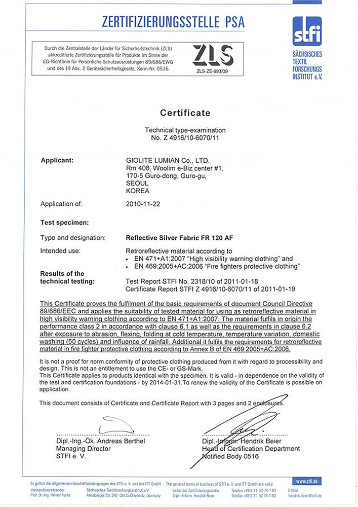 Acquisition of European certification for flame-resistant reflective tape (EN 469, EN 532, EN 533).