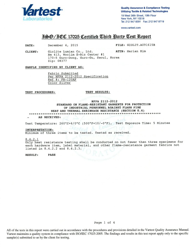 NFPA 2112-2012 방염 인증