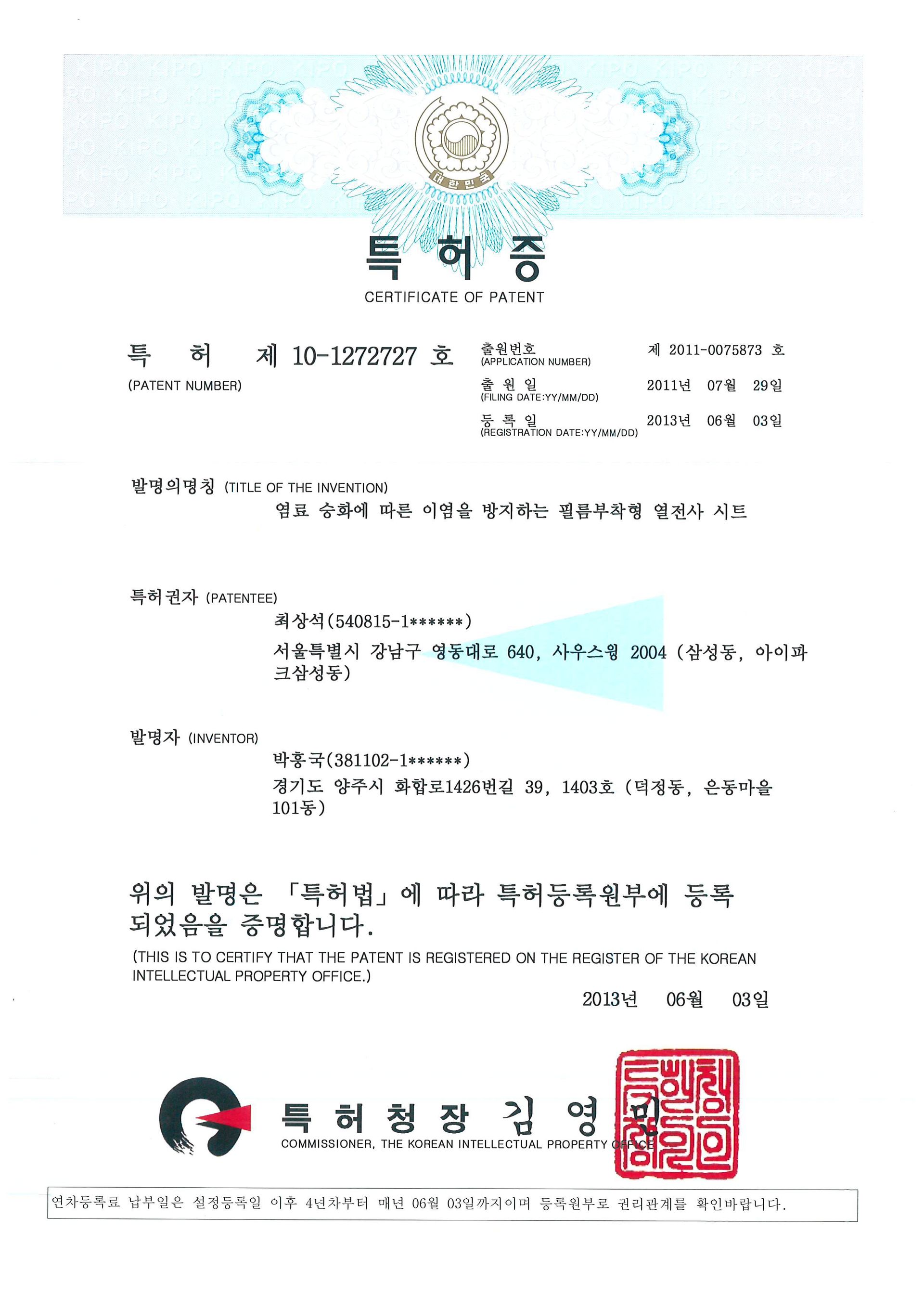 특허 출원 [제 10-1272727호]