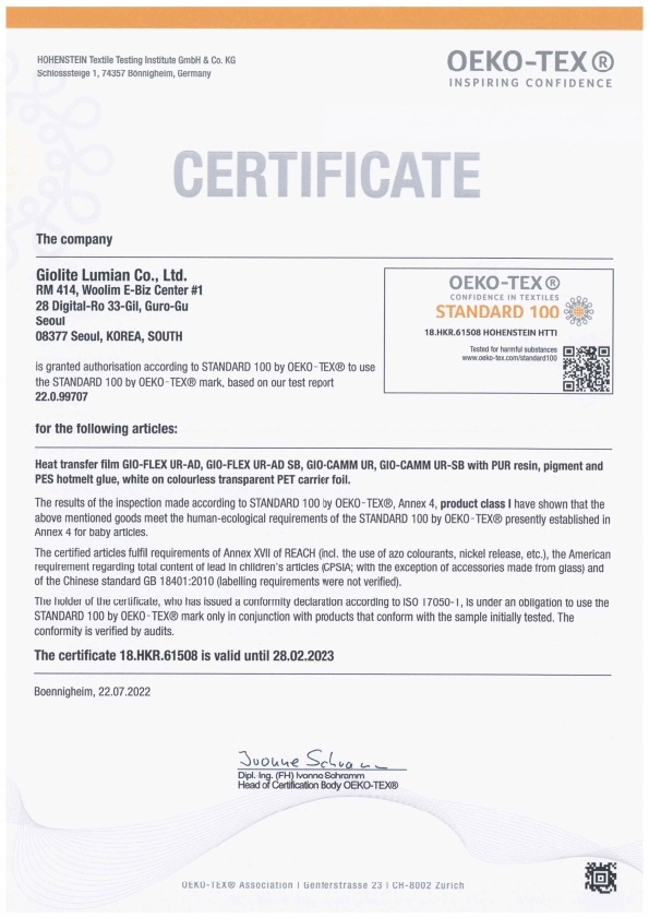 OEKO TEX STANDARD 100 [GIO-FLEX UR-AD, PU RESIN 外]