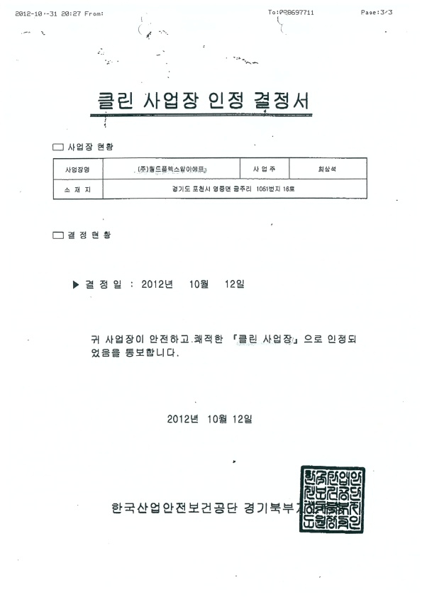 한국산업안전보건공단 클린 사업장 인정 [(주)지오플렉스]