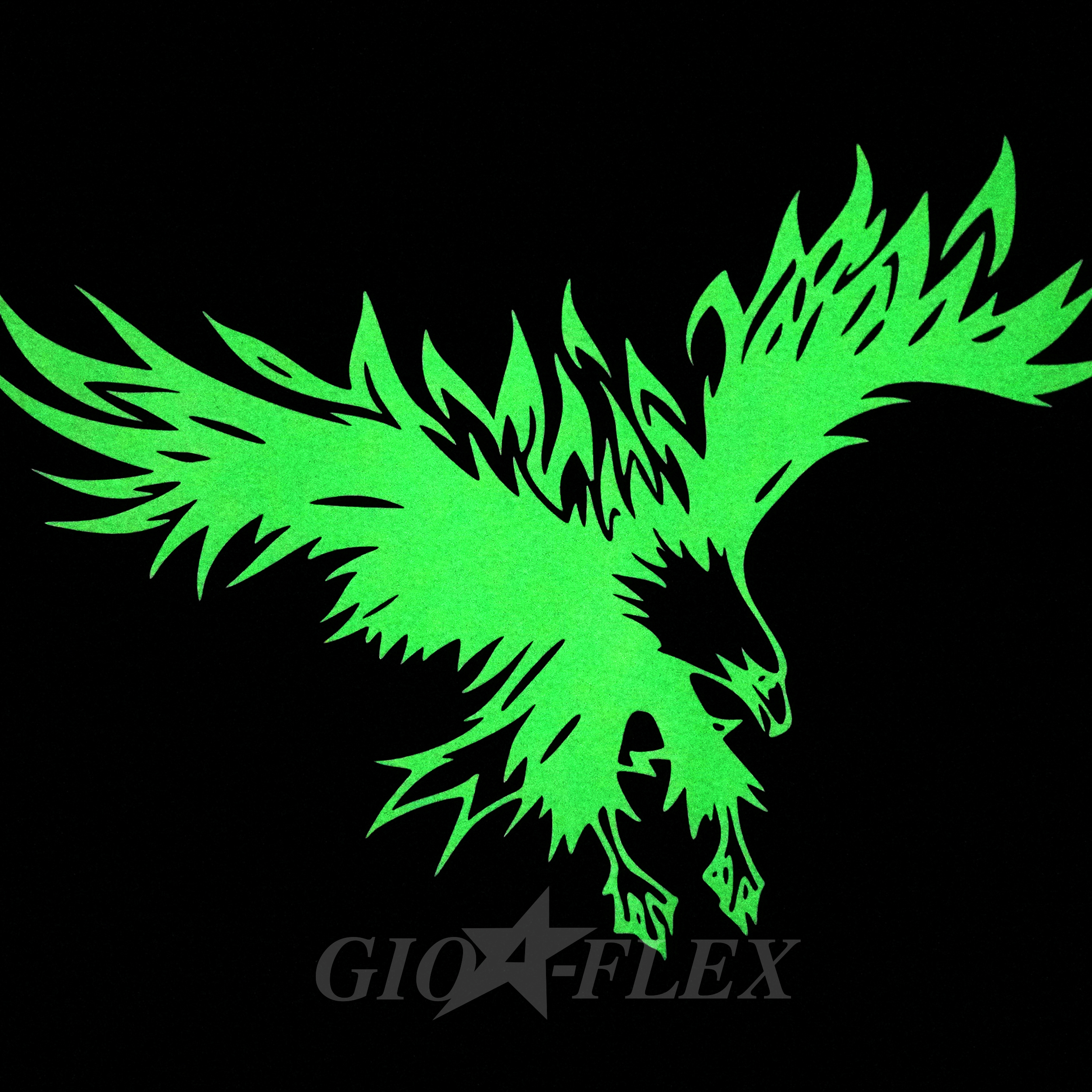 GIO-FLEX GLOW 축광(Glow in the Dark) 열전사 필름은 햇빛이나 형광등 등 광원에 노출되면 빛을 저장하고, 어두운 환경에서 은은한 연녹색 빛을 발산하는 포토루미네센트(Photoluminescent) 효과의 필름입니다.
