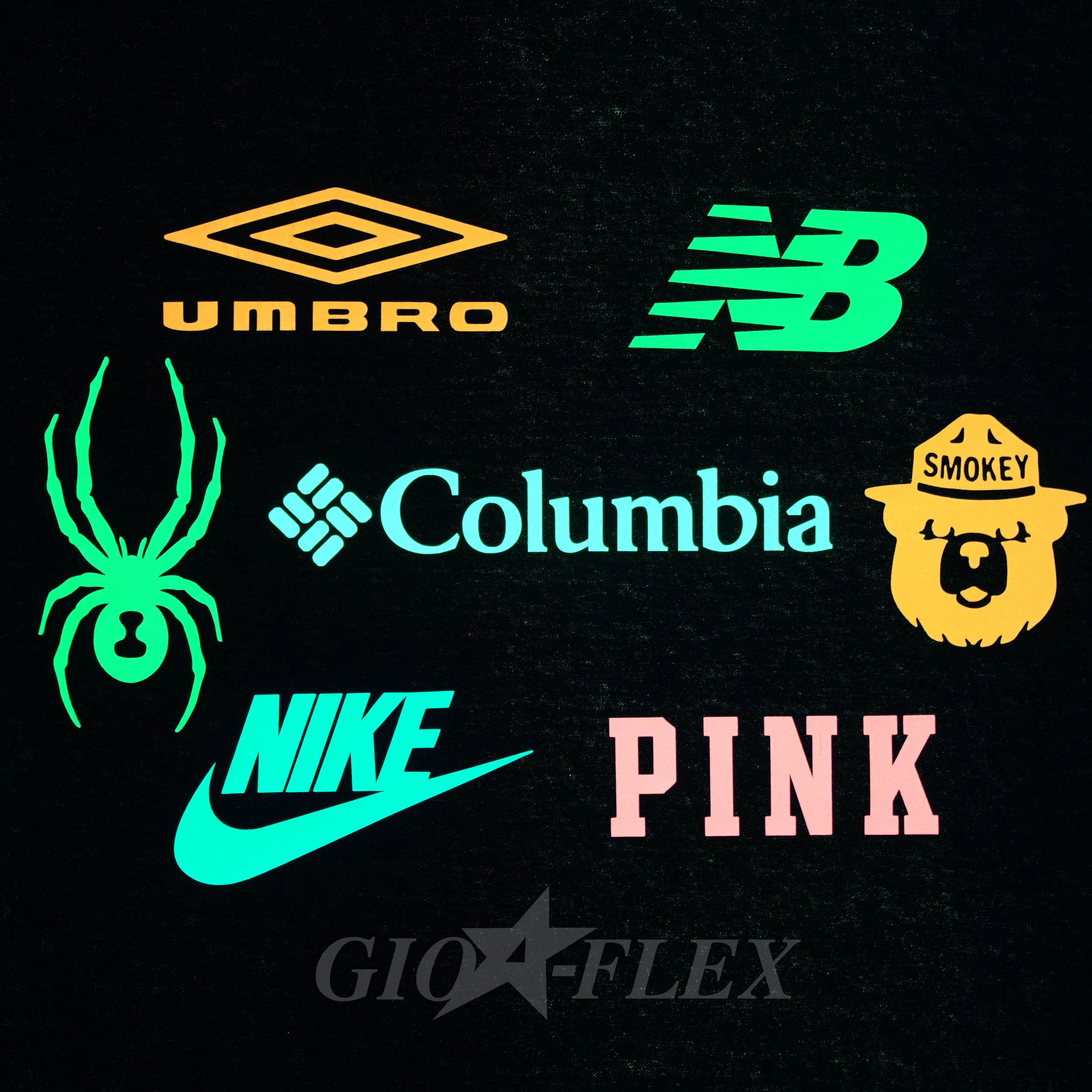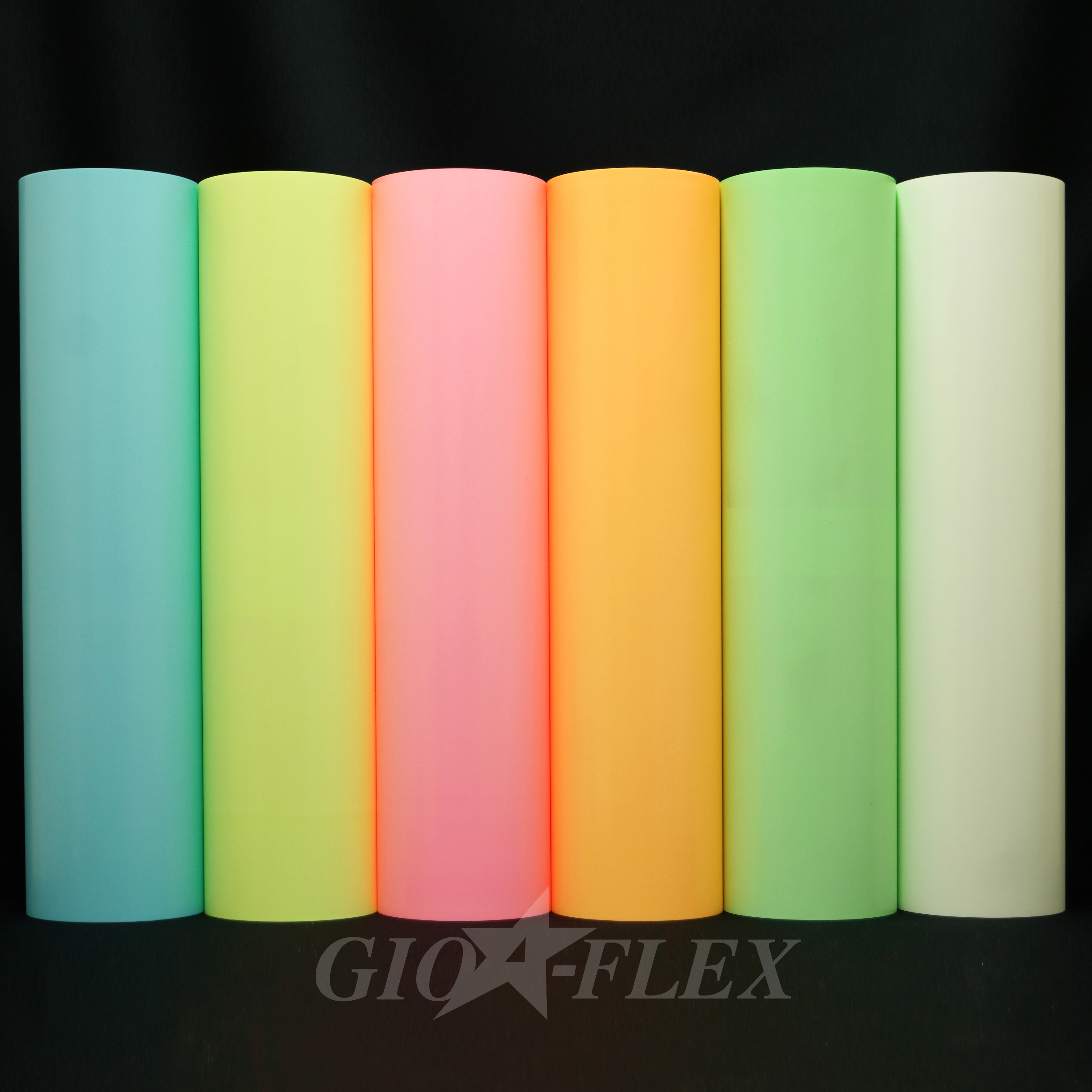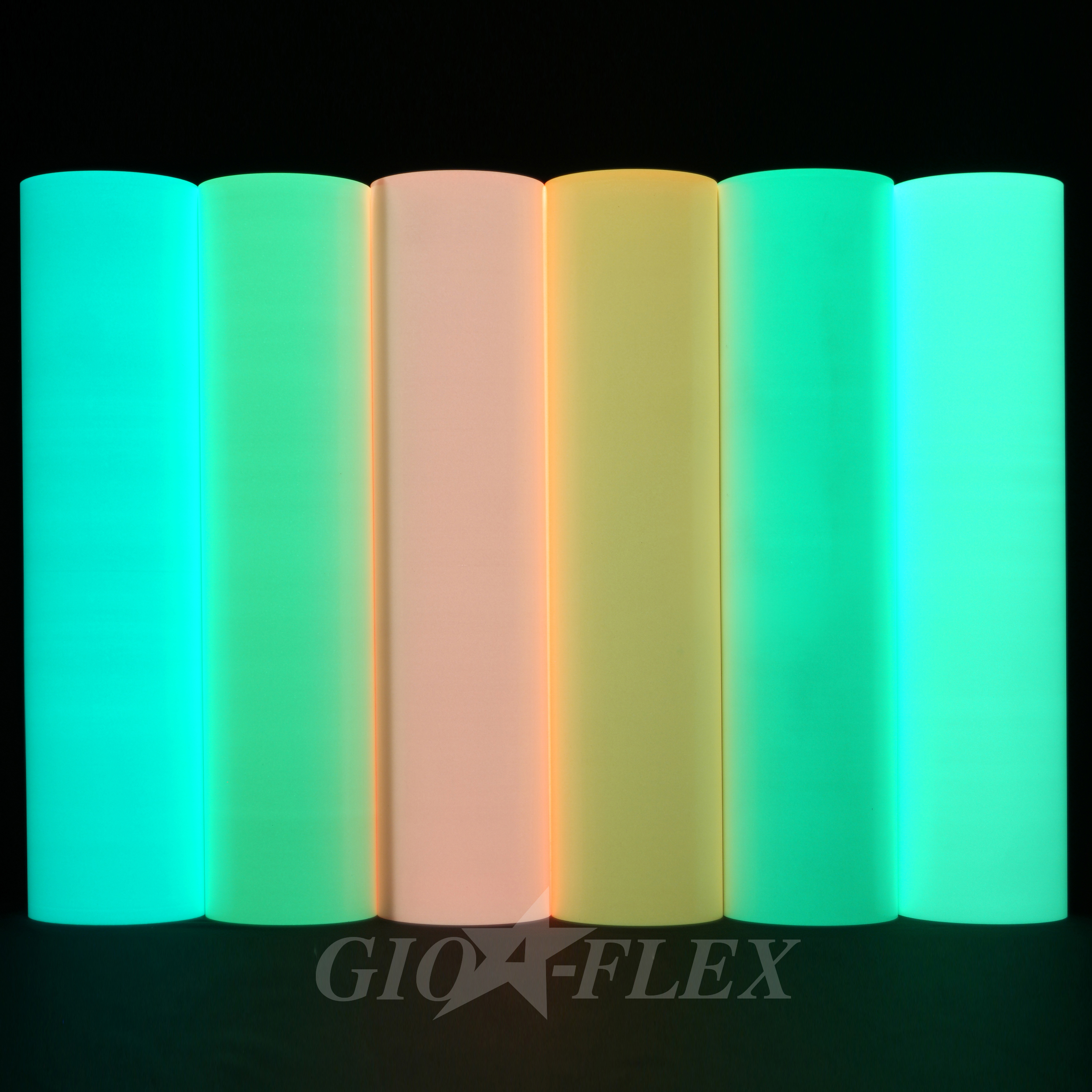 GIO-FLEX GLOW is a photoluminescent heat transfer film that stores light when exposed to sunlight or fluorescent light and emits a soft glow-in-the-dark effect in low-light environments.